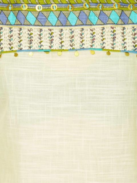 Beige kurta made of 100% cotton, with short sleeves, Boat neck with beige piping and has a printed upper chest panel with sequins