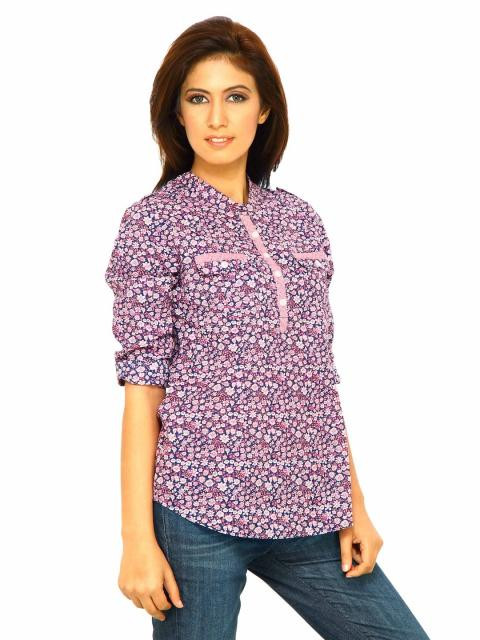 Floral print top made of 100% cotton, with Nehru collar and buttoned chest placket, long sleeves, two buttoned flap pockets on the chest, lace detailing on the pocket flaps and chest placket, and has a curved hemline
