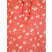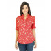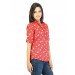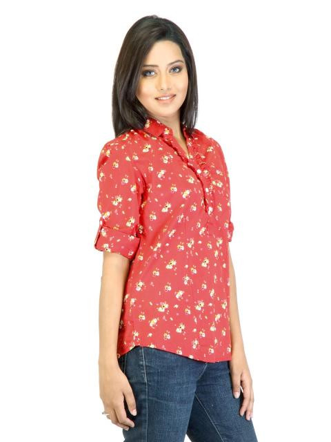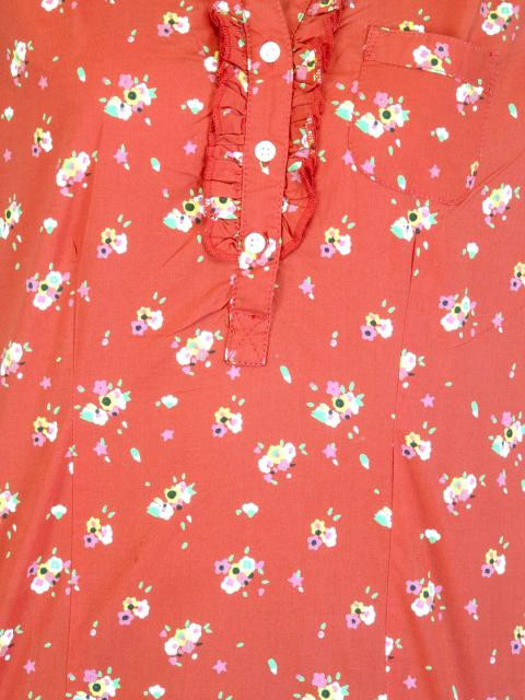 Printed red top made of 100% cotton, has long sleeves, a spread collar with a V-neckline, half buttoned placket, ruffles along the placket, a patch pocket on the left chest and flaring pintucks at the yoke at the back
