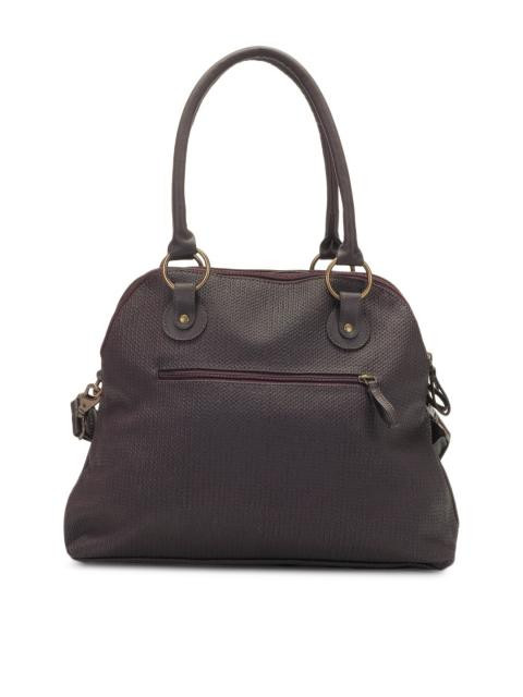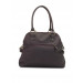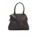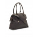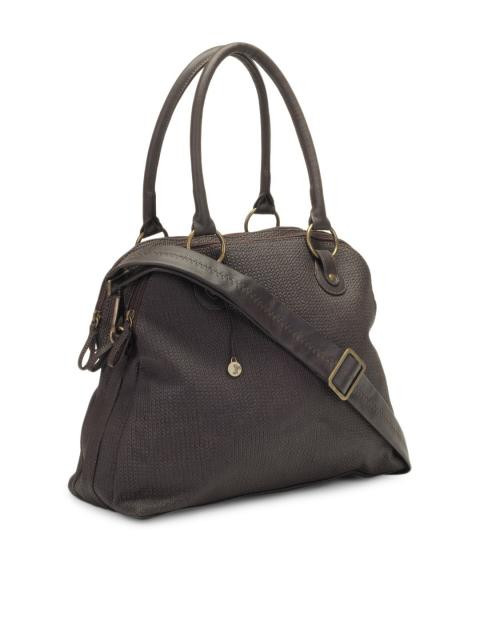 Brown handbag with knitted texture that has two short handles woven through metallic loops and a brand badge hanging through the loops