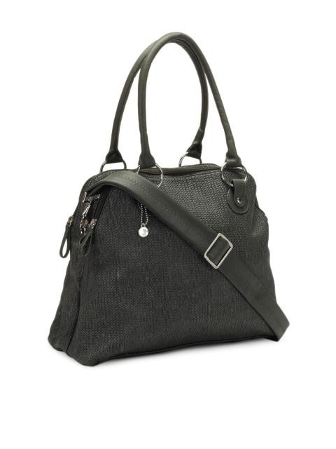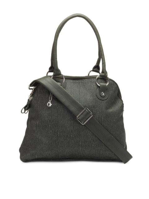 Olive green handbag with knitted texture with two short handles woven through metallic loops and a brand badge hanging through the loops