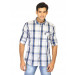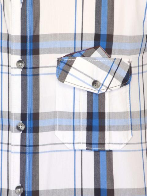 White full-sleeve shirt with blue and black checks, made of 100% cotton, has a tipped collar with buttons, full front button placket, pocket on left chest, and has a curved hem