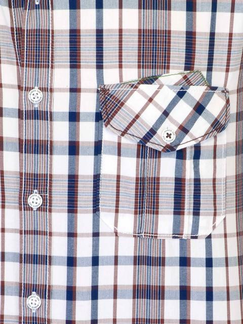 White full-sleeve shirt with blue and brown plaid checks, made of 100% cotton, has a tipped collar with buttons, full front button placket, pocket on left chest, and has a curved hem