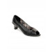 Peep toed shoe with plaid inner, has a metal embellishment with tucks at the forefoot