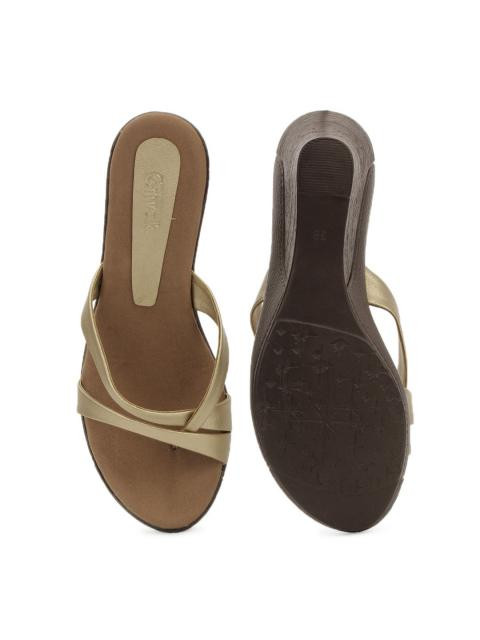 Dull gold criss-crossing forefoot and midfoot straps which form a toe holder