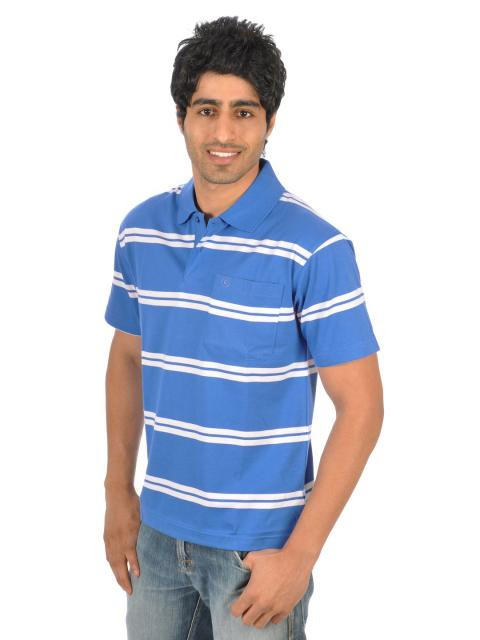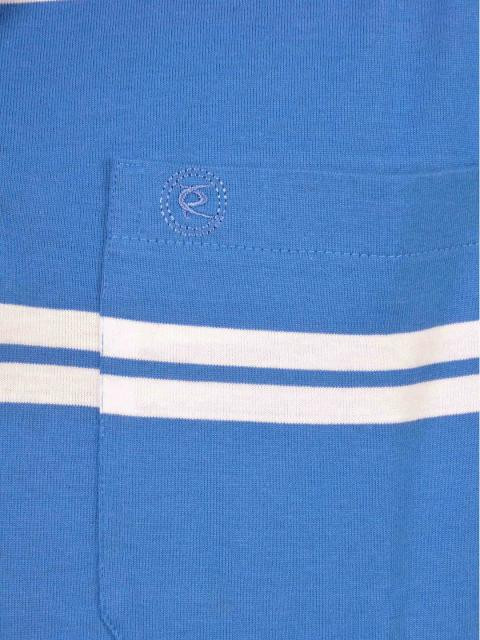 Blue polo neck t-shirt with white stripes, made of 100% cotton with ribbed collar and short buttoned placket, tape detailing on the inseam of the collar, vented hems and pocket with embroidered logo on left side of the chest