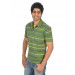 Green polo neck t-shirt with beige and dark blue stripes, made of 100% cotton with ribbed collar and short buttoned placket, tape detailing on the inseam of the collar, vented hems and pocket with embroidered logo on left side of the chest