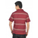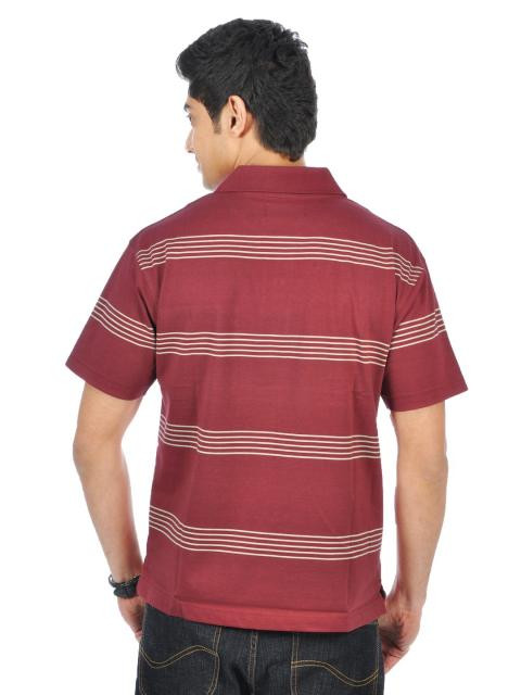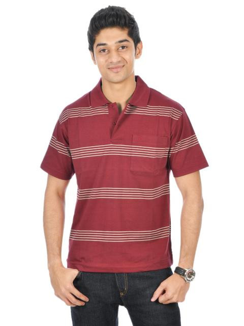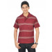Maroon polo neck t-shirt with beige stripes, made of 100% cotton with ribbed collar and short buttoned placket, tape detailing on the inseam of the collar, vented hems and pocket with embroidered logo on left side of the chest