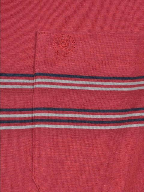Maroon polo neck t-shirt with grey and dark blue stripes, made of 100% cotton with ribbed collar and short buttoned placket, tape detailing on the inseam of the collar, vented hems and pocket with embroidered logo on left side of the chest