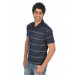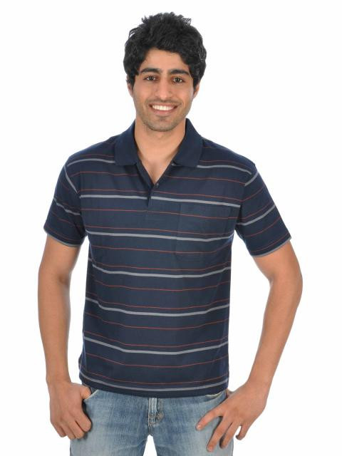 Navy blue polo neck t-shirt with grey and orange stripes, made of 100% cotton with ribbed collar and short buttoned placket, tape detailing on the inseam of the collar, vented hems and pocket with embroidered logo on left side of the chest
