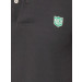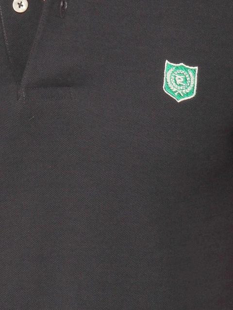 Navy blue polo neck t-shirt made of 60% cotton and 40% polyster, with a green and white tipped ribbed collar and cuffs, vented sides and embroidered logo on the left chest