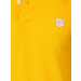 Mustard yellow polo neck t-shirt made of 60% cotton and 40% polyster, with a purple and white tipped ribbed collar and cuffs, vented sides and embroidered logo on the left chest