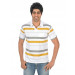 White johny neck t-shirt with mustard yellow and grey stripes in varying widths made of 100% cotton with ribbed collar and placket, tape detailing on the inseam of the collar, vented hems and pocket with embroidered logo on left side of the chest