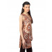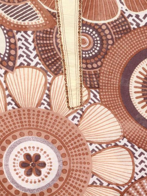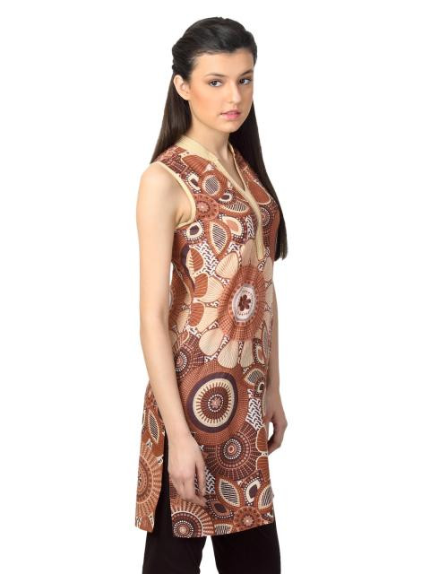 Brown printed sleeveless kurta that has a mandarin collar with a split neckline, stitch detailing along the neckline and mock placket with sequins and split side seams