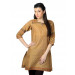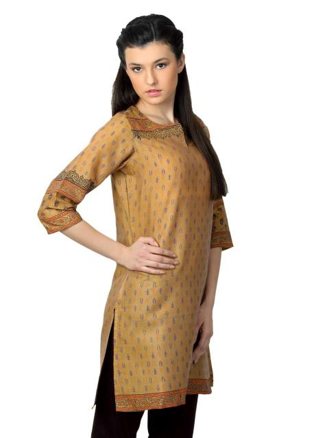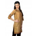 Mustard kurta with black and red traditional artwork throughout, has a round neck with sequin and stiched detailing, three quarter sleeves and split side seams