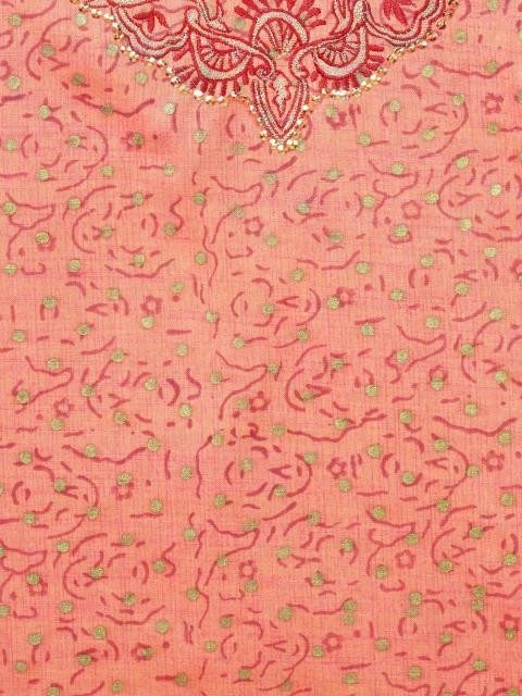 Orange, gold and maroon printed kurta with a round neck, three quarter sleeves with a maroon design on the cuffs, yoke that has a maroon design on the front with golden sequins and split side seams