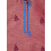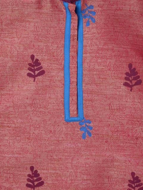 Pink kurta with a mandarin collar, blue and purple detailing along the neckline, traditional artwork, three quarter sleeves and split side seams