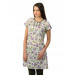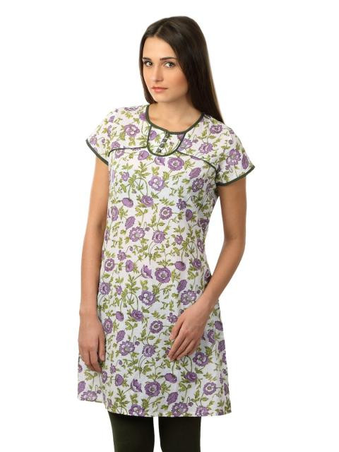 White kurta with purple and green floral print, has a round neck with a four button placket, short sleeves and split side seams