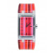 Red and purple striped dial with brand name running across from 7 to 11 o& rsquo clock marking in silver, and 12, 3 and 6 o& rsquo clock marking lines
