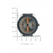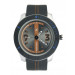 Silver and orange dial with branding at the 6 hour mark and brand logo at the 12 hour mark