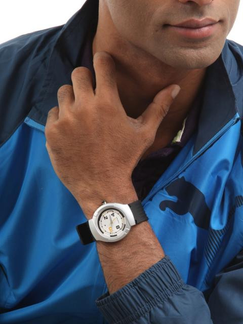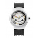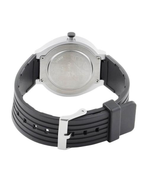 Black, embossed fibre strap with a tang clasp for comfort and style