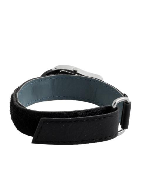 Black leather strap with zippered detail and velcro clasp for comfort and style