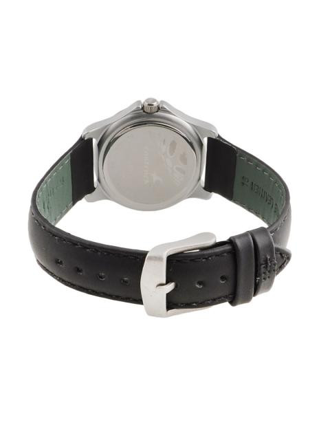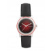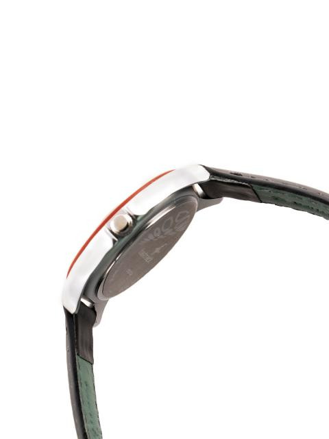 Red dial with branding at the 3 hour mark and brand logo at the 9 hour mark