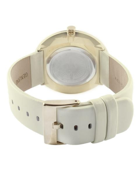 Case style: Analogue watch with a circular caseDial style: White dial with stone-studded detailFeatures: A screw to reset timeStrap style: White leather strap secured with a tang claspWater-resistant up to 50 mComes in a signature FCUK caseWarranty: 2 years against manufacturing defects from the date of purchase
