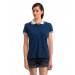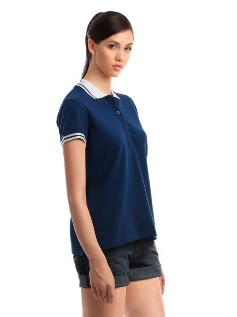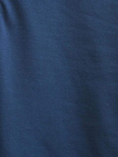 Blue polo T-shirt, has a ribbed tipped collar, half-buttoned placket, short sleeves with ribbed cuffs and a vented hem