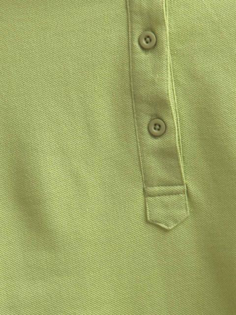 Lime green polo T-shirt, has a ribbed tipped collar, half-buttoned placket, short sleeves with ribbed cuffs and a vented hem