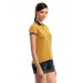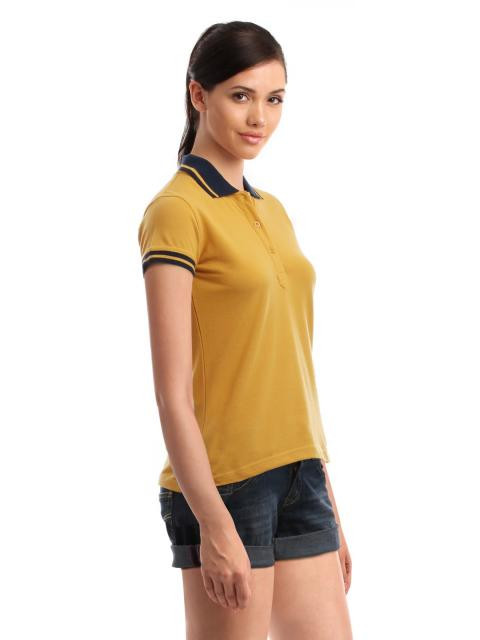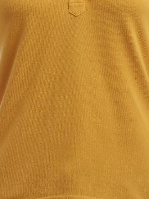 Mustard polo T-shirt, has a ribbed tipped collar, half-buttoned placket, short sleeves with ribbed cuffs and a vented hem