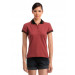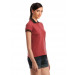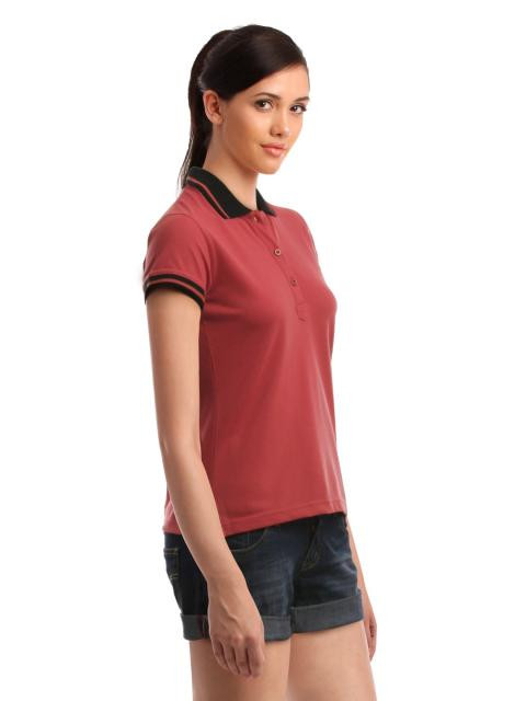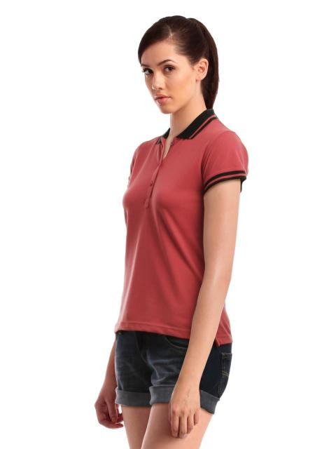 Pale red polo T-shirt, has a ribbed tipped collar, half-buttoned placket, short sleeves with ribbed cuffs and a vented hem