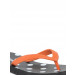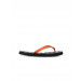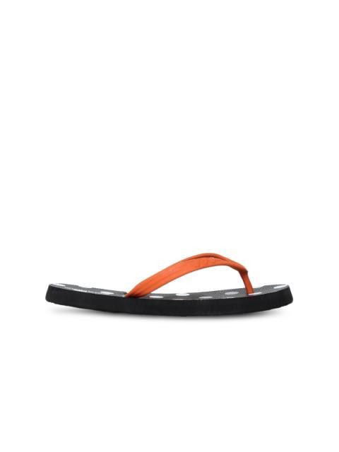 Black and orange flip flops with a orange thong style upper and polka dot on the footbed