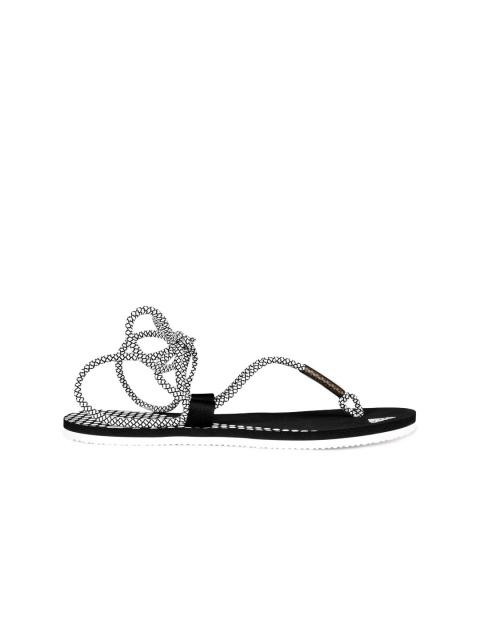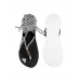 Printed black and white footbed with three points holding a lace (that act as thong straps)
