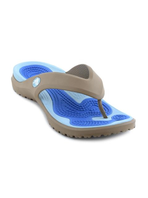 Enjoy summer in these stylish khaki flip flops from crocs. The blue croslite footbed provides ergonomic Fit and comfort, coupled with superior shock absorption. The leaf pattern and blue pivot points on the outsole provide superior grip and stability, making it a perfect footwear for a day on the beach or for urban life.