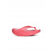 Fluroscent peach flip flops with rubber thong straps, has branding on the right strap