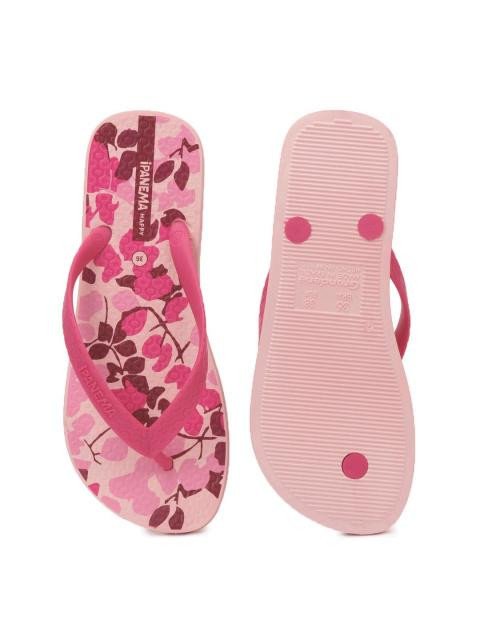 Pink flip flops, has a thong style upper with textured patterns and branding on it