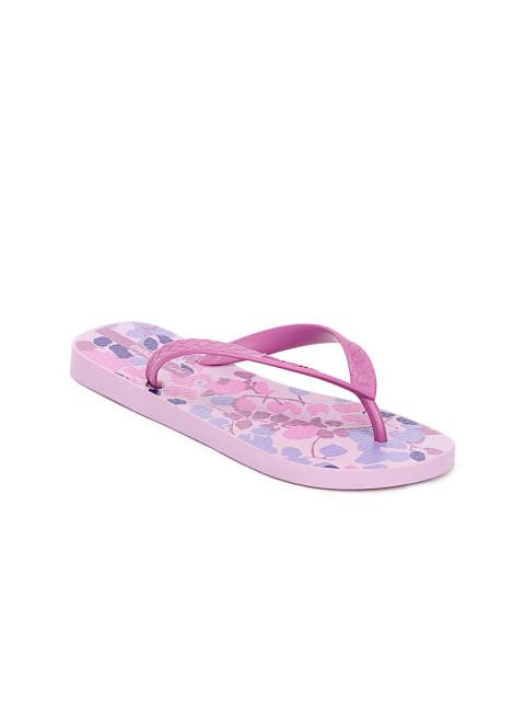 Pink flip flops, has a thong style upper with textured patterns and branding on it