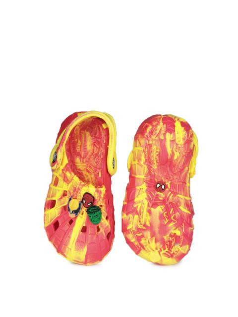 Yellow and orange sandals with badges featuring Marvel heroes on upper