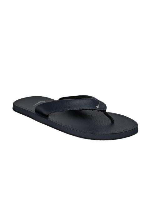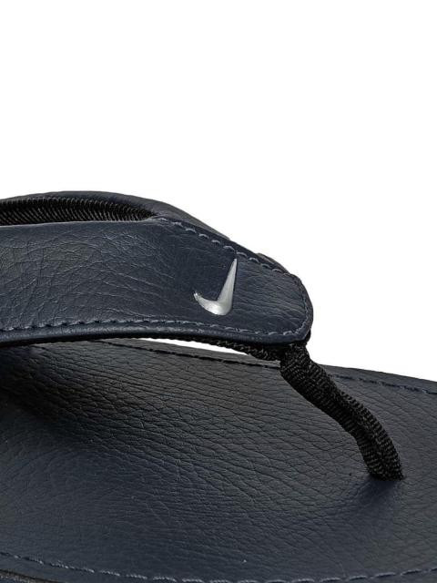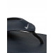 Navy blue flip flops with synthetic leather thong style straps with branding