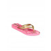 Gold flip flops, has a thong style upper with textured patterns and branding on it
