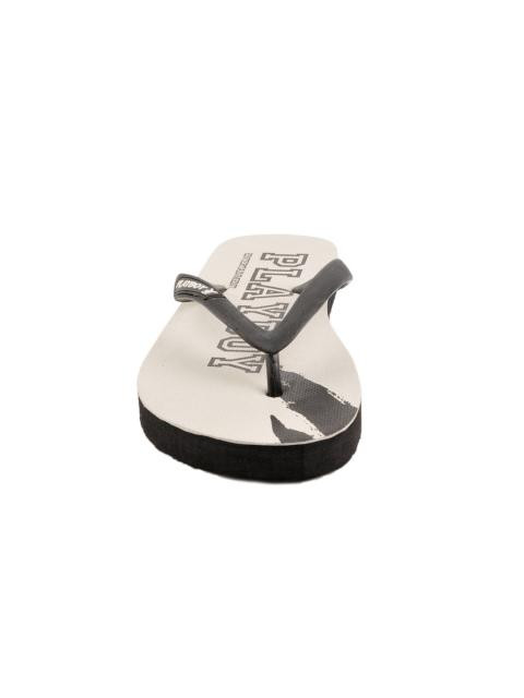 Soft, cushioned rubber footbed with printed brand name across the length of the right slipper footbed and the sketch image of a playboy on the left one