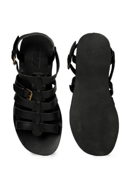 Black sandals with forefoot, midfoot and ankle straps with a strap looping around the ankle and a tang clasp
