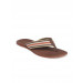 Brown sandal with fabric thong style straps in colourful stripes and a toe separator
