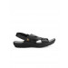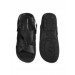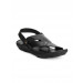 Black sandals with criss-crossing forefoot and midfoot straps, has a back strap riveted to the upper