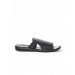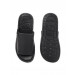 Round toed black sandals with a velcro closure at the side in the midfoot region
