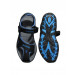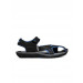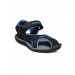 Blunt toed floaters in black and blue with an upraised heel and ankle loop straps with Velcro closures