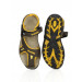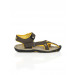 Blunt toed sandals in olive green and yellow with a slight heel, forefoot and ankle loop straps with Velcro closures