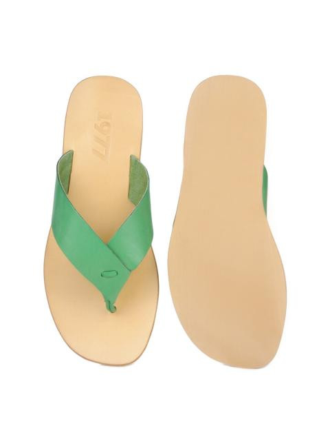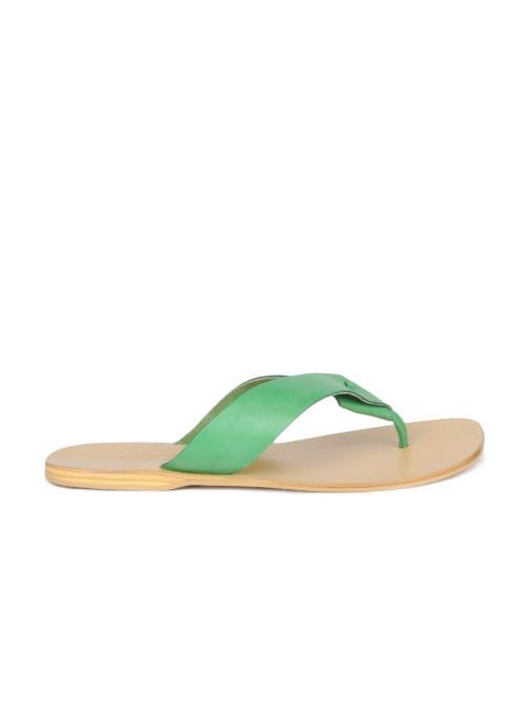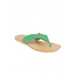 Beige sandal with leather upper with thong style straps in green and a toe separator