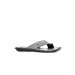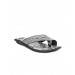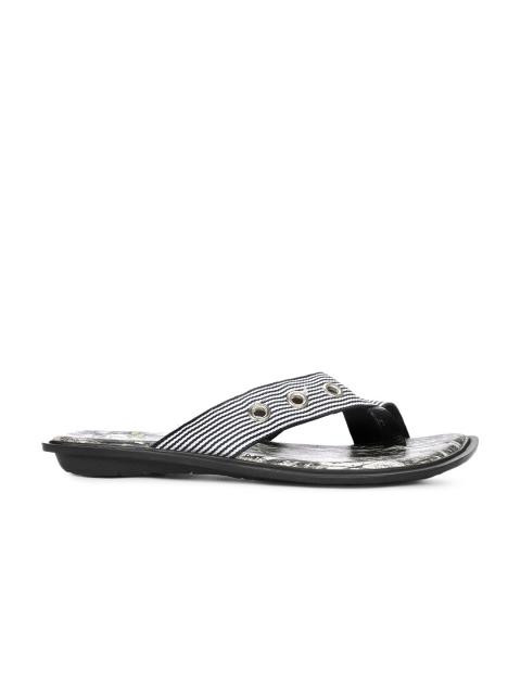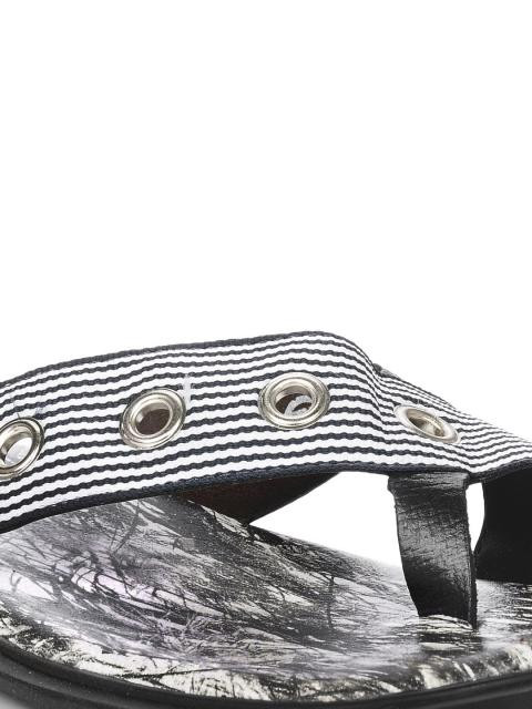Black and white thong style upper with one strap in black and white striped canvas with eyelets on it and the other in solid black synthetic leather
